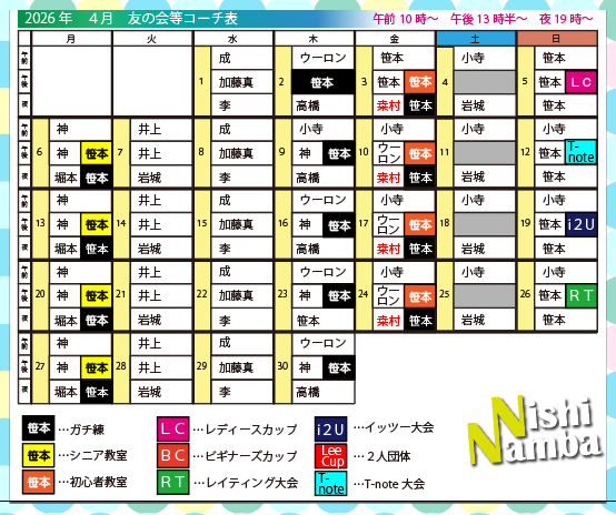 今月のコーチ変更情報 2026 3/31 大会情報 教室情報 2026-03-31 友の会 ※金曜夜の友の会は桒村コーチが担当します。 各種大会情報 3/1 西ナンバレディースカップ 3/8 i2Uなんばカップ 3/15 Lee CUP 西ナンバ2人団体 3/22 ビギナーズカップ 3/29 西ナンバレイティング大会 廣瀬教室情報 火曜教室 3/31 13時~15時 4/7 13時~15時 4/14 13時~15時 4/28 13時~15時 カットマン・カット打ち教室 4/4 15時~17時 大会情報 教室情報 ペン粒‥ タイのエースと この記事を書いた人 nishi-namba.ttc 西ナンバ卓球センターの公式アカウントです。教室情報や、大会情報などお店にまつわる情報を配信しています。 関連記事 t-note 4/12 2026-03-26 これからのビギナーズカップについて 2026-02-02 桒村コーチ紹介! 2026-02-01 ビギナーズカップ空いております! 2026-02-01 練習相手代行サービス 2026-01-26