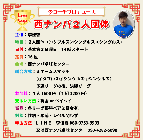 李コーチが主催する二人団体です。賞金もあり、ダブルスもシングルスも楽しめるので人気です。昼からスタートなので午前中は用事もすることができ、タイパよく試合ができるのでおすすめです。